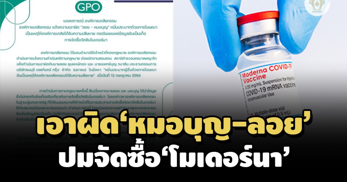 องค์การเภสัชกรรม แจ้งความเอาผิด 'หมอบุญ-ลอย' ในข้อหาหมิ่นประมาทด้วยการโฆษณา เป็นเหตุให้องค์การเกสัชได้รับความเสียหาย กรณีเผยแพร่ข้อมูลอันเป็นเท็จการจัดซื้อวัคซีนโมเดอร์นา