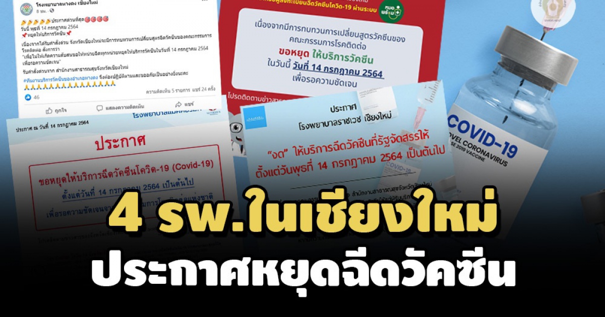 ผู้สื่อข่าวรายงานว่า เมื่อวันที่ 14 ก.ค. 2564 โรงพยาบาลหลายแห่งในจังหวัดเชียงใหม่ ได้แก่ โรงพยาบาลราชเวช โรงพยาบาลกรุงเทพเชียงใหม่ โรงพยาบาลแมคคอร์มิค และโรงพยาบาลหางดง แจ้งประกาศผ่านเพจเฟซบุ๊ก ประกาศหยุดให้บริการวัคซีนป้องกันไวรัสโควิดที่รับการจัดสรรจากรัฐบาล ตั้งแต่วันนี้เป็นต้นไป โดยระบุเหตุผลว่า เพื่อรอความชัดเจน เนื่องจากมีการทบทวนการเปลี่ยนแปลงสูตรฉีดวัคซีนของคณะกรรมการโรคติดต่อ