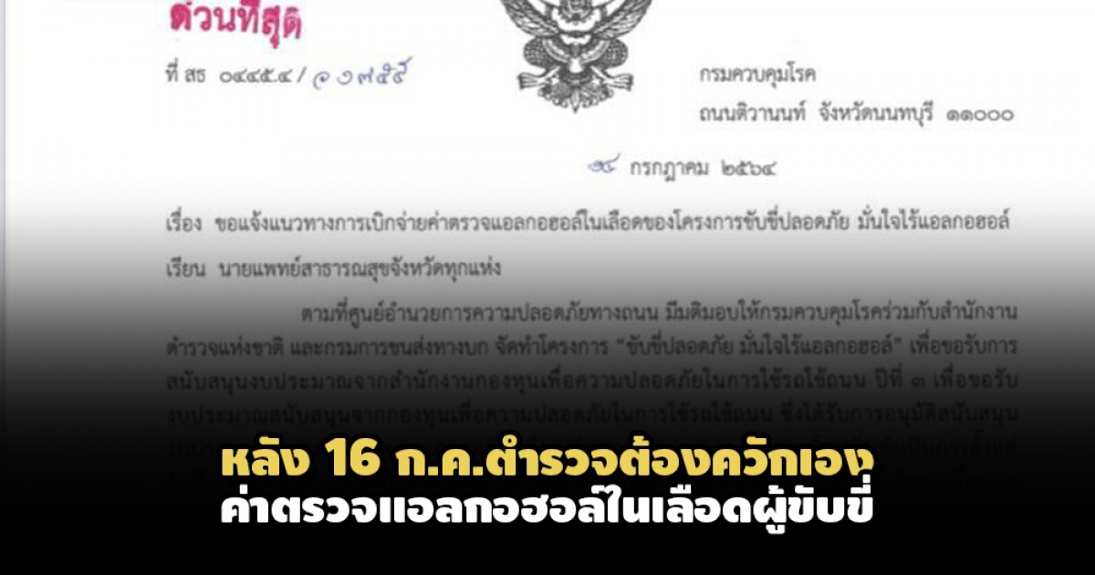 สำนักข่าวอิศรา (www.isranews.org) รายงานว่า เมื่อวันที่ 14 ก.ค. 2564 ที่ผ่านมา กรมควบคุมโรค โดย นพ.ทวีทรัพย์ ศิรประภาศิริ นายแพทย์ผู้ทรงคุณวุฒิ ปฏิบัติราชการแทนอธิบดีกรมควบคุมโรค ทำหนังสือแจ้งนายแพทย์สาธารณสุขจังหวัดทุกแห่ง เรื่อง ขอแจ้งแนวทางการเบิกจ่ายค่าตรวจแอลกอฮอล์ในเลือดของโครงการขับขี่ปลอดภัย มั่นใจไร้แอลกอฮอล์
