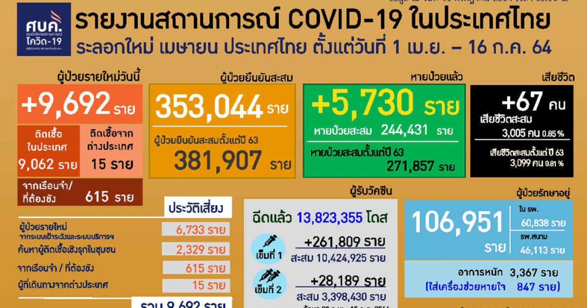 สำนักข่าวอิศรา (www.isranews.org) รายงานว่า เมื่อวันที่ 16 ก.ค. 564 ศูนย์บริหารสถานการณ์โควิด (ศบค.) เผยแพร่สถานการณ์โควิดประจำวัน โดยพบผู้ติดป่วยรายใหม่ 9,692 ราย แบ่งเป็นการติดเชื้อในประเทศ 9,062 ราย เกิดจากระบบเฝ้าระวังและระบบบริการฯ 6,733 ราย เกิดจากการค้นหาเชิงรุกและพบการติดเชื้อในชุมชน 2,329 ราย ติดเชื้อภายในเรือนจำ 615 ราย และอีก 15 รายเดินทางกลับมาจากต่างประเทศ รวมผู้ป่วยสะสม 381,907 ราย หายป่วยเพิ่ม 5,730 ราย อยู่ระหว่างรักษาตัวในโรงพยาบาล 106,951 ราย โดยในจำนวนนี้มีอาการหนัก 3,367 ราย และใส่ท่อช่วยหายใจ 847 ราย เสียชีวิตเพิ่ม 67 ราย รวมเสียชีวิตสะสม 3,099 ราย