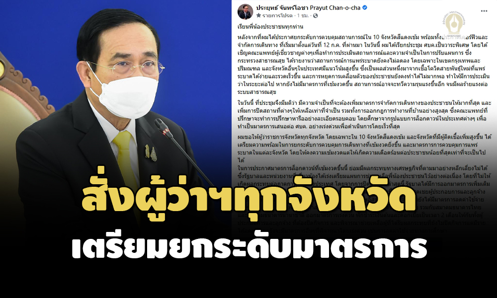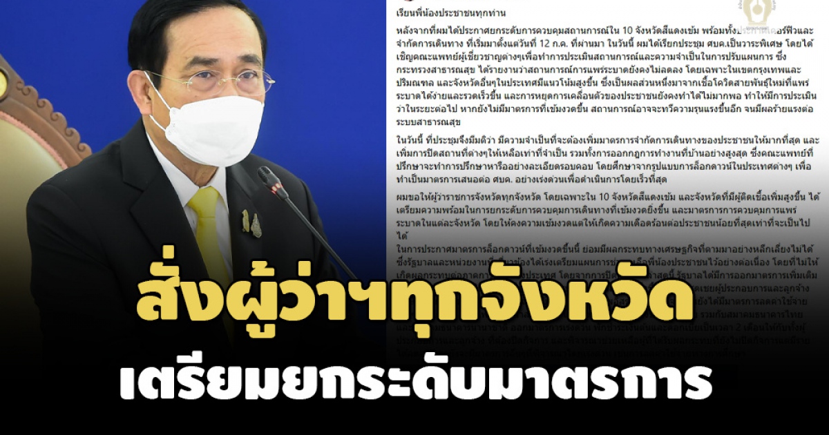 นายกรัฐมนตรี สั่งผู้ว่าฯทุกจังหวัด เตรียมความพร้อมยกระดับล็อกดาวน์ - จำกัดการเดินทาง ออกกฎการทำงานที่บ้านสูงสุด โดยเฉพาะพื้นที่ 10 จังหวัดแดงเข้ม และจังหวัดที่มีผู้ติดเชื้อเพิ่มสูง