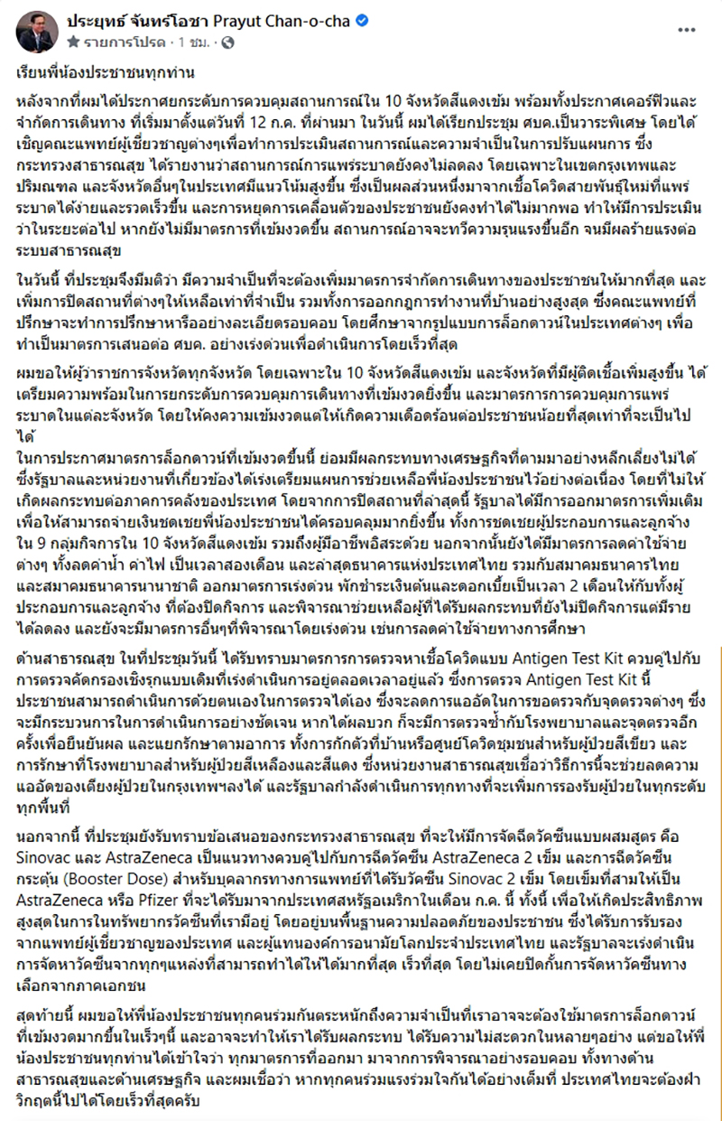 ผู้สื่อข่าวรายงานว่า เมื่อวันที่ 16 ก.ค.2564 พล.อ.ประยุทธ์ จันทร์โอชา นายกรัฐมนตรี และ รมว.กลาโหม โพสต์ข้อความผ่านเฟซบุ๊ก ประยุทธ์ จันทร์โอชา Prayut Chan-o-cha ระบุว่า หลังจากที่ตนได้ประกาศยกระดับการควบคุมสถานการณ์ใน 10 จังหวัดสีแดงเข้ม พร้อมทั้งประกาศเคอร์ฟิวและจำกัดการเดินทาง ที่เริ่มมาตั้งแต่วันที่ 12 ก.ค. ที่ผ่านมา ในวันนี้ตนได้เรียกประชุมศูนย์บริหารสถานการณ์โควิด (ศบค.) เป็นวาระพิเศษ โดยได้เชิญคณะแพทย์ผู้เชี่ยวชาญต่างๆ เพื่อทำการประเมินสถานการณ์และความจำเป็นในการปรับแผนการ ซึ่งกระทรวงสาธารณสุขได้รายงานว่าสถานการณ์การแพร่ระบาดยังคงไม่ลดลง โดยเฉพาะในเขต กทม.และปริณฑล และจังหวัดอื่นๆในประเทศมีแนวโน้มสูงขึ้น ซึ่งเป็นผลส่วนหนึ่งมาจากเชื้อโควิดสายพันธุ์ใหม่ที่แพร่ระบาดได้ง่ายและรวดเร็วขึ้น และการหยุดการเคลื่อนตัวของประชาชนยังคงทำได้ไม่มากพอ ทำให้มีการประเมินว่าในระยะต่อไป หากยังไม่มีมาตรการที่เข้มงวดขึ้น สถานการณ์อาจจะทวีความรุนแรงขึ้นอีก จนมีผลร้ายแรงต่อระบบสาธารณสุข