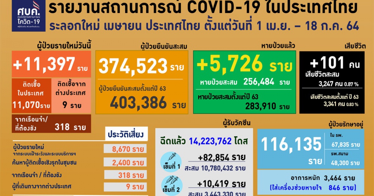 สำนักข่าวอิศรา (www.isranews.org) รายงานว่า เมื่อวันที่ 18 ก.ค.2564 ศูนย์บริหารสถานการณ์โควิด (ศบค.) รายงานสถานการณ์ประจำวัน โดยพบผู้ติดเชื้อรายใหม่ 11,397 ราย ติดเชื้อในประเทศ 11,070 ราย เกิดจากระบบเฝ้าระวังและระบบบริการฯ 8,670 ราย เกิดจากการค้นหาเชิงรุกในชุมชน 2,400 ราย ติดเชื้อภายในเรือนจำ 318 ราย และอีก 9 ราย เดินทางกลับมาจากต่างประเทศ รวมผู้ป่วยสะสม 403,386 ราย หายป่วยเพิ่ม 5,726 ราย อยู่ระหว่างรักษาตัวในโรงพยาบาล 116,135 ราย โดยในจำนวนนี้มีอาการหนัก 3,464 ราย และใส่ท่อช่วยหายใจ 846 ราย เสียชีวิตเพิ่ม 101 ราย รวมเสียชีวิตสะสม 3,341 ราย
