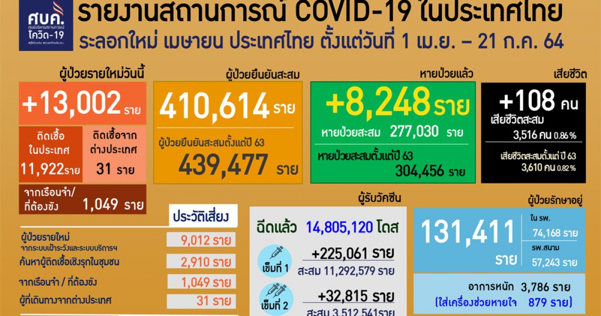 สำนักข่าวอิศรา (www.isranews.org) รายงานว่า เมื่อวันที่ 21 ก.ค.2564 พญ.อภิสมัย ศรีรังสรรค์ ผู้ช่วยโฆษกศูนย์บริหารสถานการณ์โควิด (ศบค.) รายงานสถานการณ์ประจำวัน โดยพบผู้ติดเชื้อรายใหม่ 13,002 ราย ติดเชื้อในประเทศ 11,922 ราย เกิดจากระบบเฝ้าระวังและระบบบริการฯ 9,012 ราย เกิดจากการค้นหาเชิงรุกในชุมชน 2,910 ราย ติดเชื้อภายในเรือนจำ 1,049 ราย และอีก 31 ราย เดินทางกลับมาจากต่างประเทศ รวมผู้ป่วยสะสม 439,477 ราย หายป่วยเพิ่ม 8,248 ราย อยู่ระหว่างรักษาตัวในโรงพยาบาล 131,411 ราย โดยในจำนวนนี้มีอาการหนัก 3,786 ราย และใส่ท่อช่วยหายใจ 879 ราย เสียชีวิตเพิ่ม 108 ราย รวมเสียชีวิตสะสม 3,610 ราย