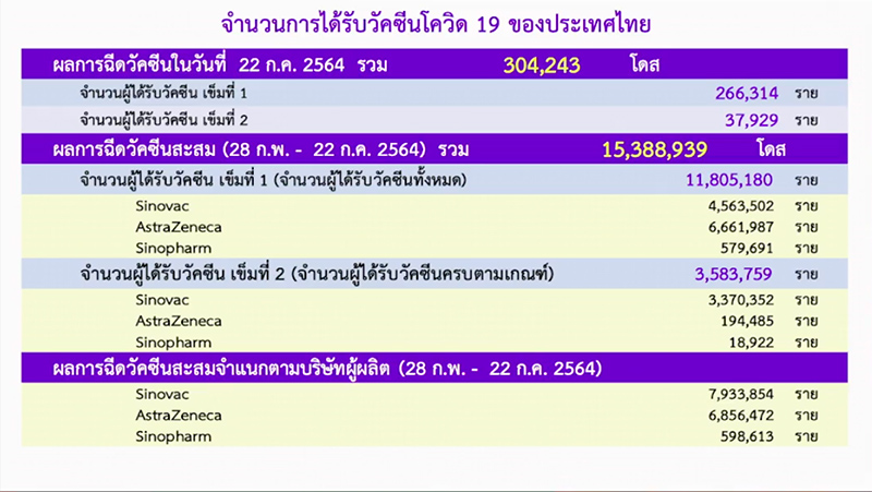 นพ.ทวีทรัพย์ กล่าวถึงสถานการณ์การฉีดวัคซีนในประเทศไทยอีกว่า เมื่อวันที่ 22 ก.ค.ที่ผ่านมา สามารถฉีดได้ 304,243 โดส เป็นเข็มแรก จำนวน 266,314 ราย และเข็มที่ 2 จำนวน 37,929 ราย รวมสะสมตั้งแต่วันที่ 28 ก.พ.-22 ก.ค.2564 รวมแล้วทั้งสิ้น 15,388,939 คน