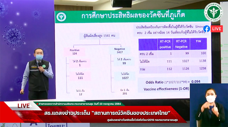 ซึ่งในช่วงที่มีการระบาดของสายพันธุ์อัลฟ่า (สายพันธุ์อังกฤษ) ใน 3 พื้นที่ คือ ภูเก็ต สมุทรสาคร และเชียงราย จากการคำนวณอัตราผู้สัมผัสเสี่ยงสูงที่ได้รับการการฉีดวัคซีนซิโนแวคครบ 2 เข็ม อย่างน้อย 14 วัน เปรียบเทียบกับผู้ที่ไม่ได้รับการฉีดวัคซีน พบว่าใน 3 พื้นที่ ผู้ที่ฉีดวัคซีนมีประสิทธิผลใกล้เคียงกันประมาณ 90%