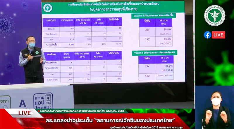 ส่วนประสิทธิผลในการป้องกันสายพันธุ์เดลต้า (สายพันธุ์อินเดีย) ที่กำลังระบาดอยู่ในขณะนี้ กำลังอยู่ในขั้นตอนการศึกษาและเก็บรวบรวมข้อมูล โดยเราได้ออกแบบในการเก็บข้อมูลตั้งแต่ช่วงเริ่มการระบาดในเดือน มิ.ย.2564 ตอนนั้นมีการระบาดของสายพันธุ์เดลต้าอยู่ 30% ซึ่งเบื้องต้นตัวเลขจากการติดตามประสิทธิผลของวัคซีนต่อสายพันธุ์เดลต้ายังคงเดิม อย่างไรก็ตามในช่วงนี้สายเดลต้าได้ลามไปเกินกว่าครึ่งแล้วต้องรอติดตามไปอีกสักเดือน