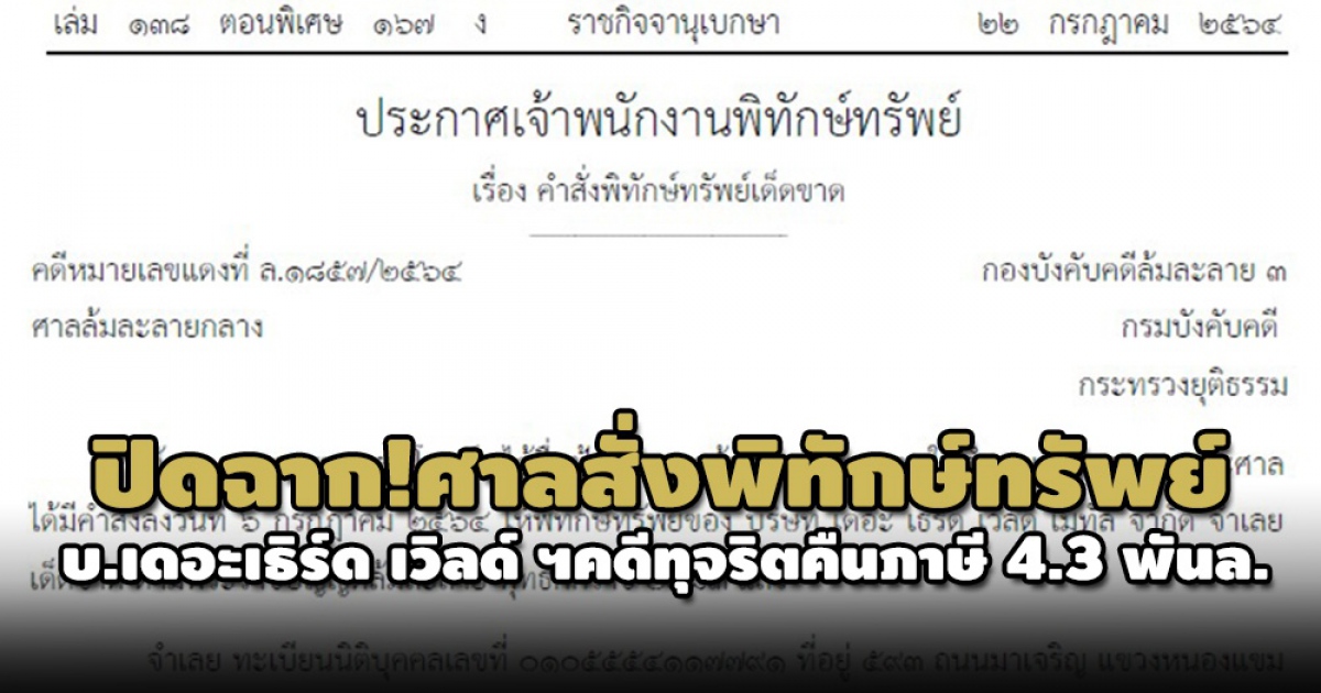 สำนักข่าวอิศรา (www.isranews.org) รายงานว่าราชกิจจานุเบกษา วันที่ 22 ก.ค.2564 เผยแพร่ประกาศเจ้าพนักงานพิทักษ์ทรัพย์เรื่อง คำสั่งพิทักษ์ทรัพย์เด็ดขาด ราย บริษัท เดอะ เธิร์ด เวิลด์ เมทัล จำกัด โดยมีกรมสรรพากร โจทก์ ได้ยื่นฟ้องต่อศาลล้มละลายกลางขอให้จำเลยล้มละลายและศาลได้มีคำสั่งลงวันที่ 6 ก.ค.2564 จำเลย ทะเบียนนิติบุคคลเลขที่ 0105554117791 ที่อยู่ 593 ถนนมาเจริญ แขวงหนองแขมเขตหนองแขม กรุงเทพมหานคร