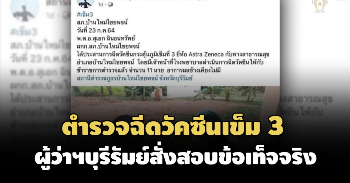 ผู้ว่าฯ บุรีรัมย์ แต่งตั้งรองผู้ว่าฯ นำทีมสอบข้อเท็จจริง กรณีโซเชียลฯแชร์ภาพ ตำรวจ สภ.บ้านใหม่ไชยพจน์ ฉีดวัคซีนแอสตร้าเซนเนก้าเข็มที่ 3 อาจขัดคำสั่งคณะกรรมการโรคติดต่อจังหวัด ที่มีมติให้ฉีดเฉพาะแพทย์ด่านหน้า พร้อมส่งหนังสือแจ้งปลัด สธ.แล้ว - ผกก.สภ.บ้านใหม่ไชยพจน์ แจงไม่ทราบเรื่อง เพราะลาราชการวันดังกล่าว