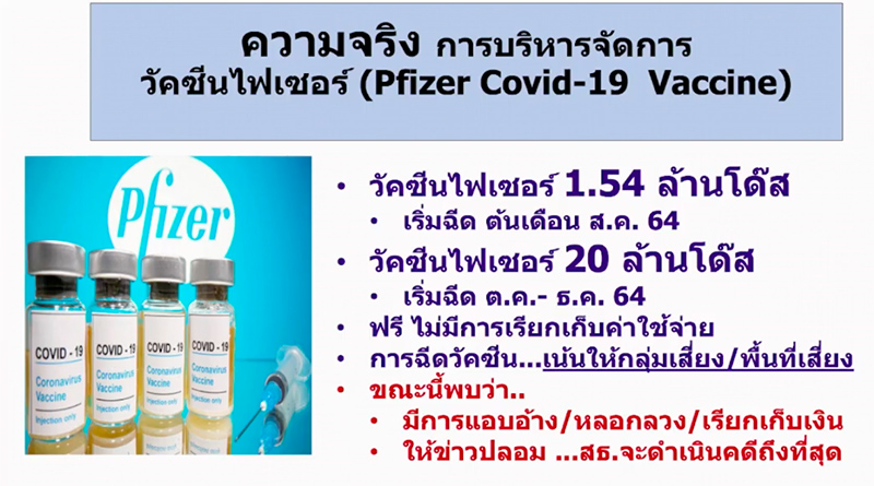 ส่วนวัคซีนไฟเซอร์จำนวน 20 ล้านโดส ที่จะเข้ามาในเดือน ต.ค.-ธ.ค.2564 จะเน้นให้กลุ่มเสี่ยงเช่นเดียวกัน พร้อมขอย้ำว่าวัคซีนไฟเซอร์จำนวนทั้งหมด 21.5 ล้านโดส จะไม่มีการเรียกเก็บค่าใช้จ่ายใดๆ ทั้งสิ้น หากพบว่ามีการเรียกเก็บค่าใช้จ่ายหรือให้ข่าวปลอม ทางกระทรวงสาธารณสุขจะดำเนินคดีจนถึงที่สุด