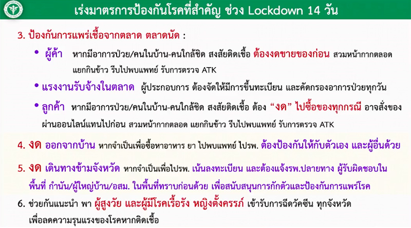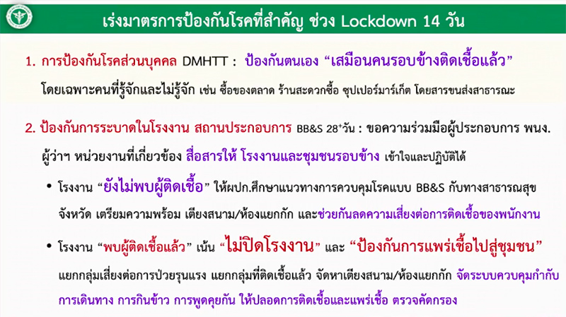 ดังนั้นประชาชนควรดำเนินมาตรการป้องกันที่สำคัญในช่วงล็อกดาวน์ 14 วัน ดังนี้้