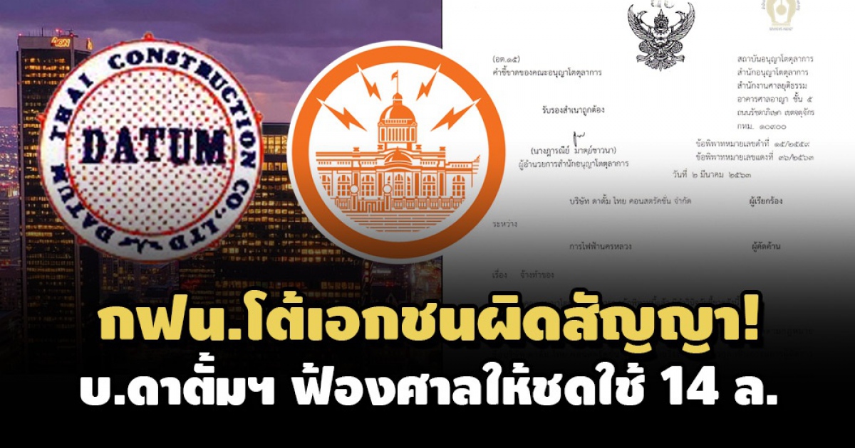 บ.ดาตั้มไทยฯ ยื่นฟ้องศาลปค.ให้ กฟน. ชดใช้ค่าเสียหายกว่า 14 ล้าน หลังอนุญาโตตุลาการชี้ขาดข้อพิพาทให้ชำระเงินค่างานท่อร้อยสายไฟงวด 10 ที่ค้างชำระ-ค่าหลักประกันสัญญาคืนพร้อมดอกเบี้ย แค่ 5 ล้านเศษ อ้างเหตุบอกเลิกจ้างไม่ตรงตามข้อเท็จจริง ด้าน กฟน.โต้เอกชนเป็นฝ่ายผิดสัญญา-ขาดความผิดชอบ พร้อมยื่นคำร้องขอเพิกถอนคำชี้ขาด ล่าสุดเรื่องอยู่ระหว่างกระบวนการพิจารณาชั้นศาล