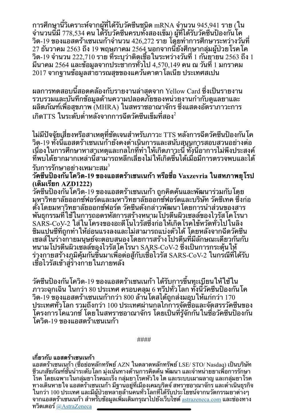 โดยเนื้อหาของเอกสารประชาสัมพันธ์นั้นระบุว่าจากการศึกษาในระดับประชากรกว่าหนึ่งล้านคน อุบัติการณ์ของการเกิดภาวะลิ่มเลือดอุดตันที่พบได้ยากนั้นต่ำกว่าที่พบในผู้ติดเชื้อโควิด-19เป็นอย่างมาก