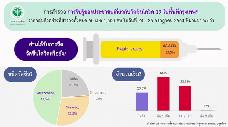 นพ.โอภาส กล่าวอีกว่า สำหรับการสุ่มตรวจประชาชนในกทม.ทั้ง 50 เขต จำนวน 1,500 ราย ระหว่างวันที่ 24-25 ก.ค.2564 พบว่ามีประชาชนฉีดวัคซีนอย่างน้อย 1 เข็มแล้ว 76.5% ซึ่งสอดคล้องกับการผลการดำเนินงานที่ผ่านมาที่พบว่า ได้รับวัคซีนแอสตร้าเซนเนก้า 47.3% ซิโนแวค 28.3% และยังไม่ได้ฉีด 23.5% นอกจากนั้นยังพบอีกว่า ในบ้านที่มีผู้สูงอายุ 65.7% ในกลุ่มนี้ได้รับวัคซีนแล้ว 79.92%
