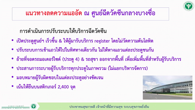 1.เปิดประตูศูนย์ฉีดกลางบางซื่อเร็วขึ้น และให้ผู้รับบริการผ่านโดยไม่ต้องวัดความดัน ยกเว้นกลุ่มผู้ที่มีความกังวลใจและมีปัญหาด้านดังกล่าวจริง ๆ ทั้งนี้ หากสังเกตที่ผ่านมาจะมีความหนาแน่นของจำนวนประชากร เฉพาะเวลาก่อน 08.00 น. หลังจากนั้นจะเบาบางลง ซึ่งวิธีดังกล่าวจะช่วยระบายประชาชนจากด้านนอก เข้าสู่ด้านในอาคารมากขึ้น