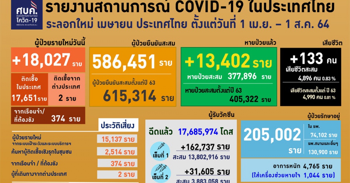สำนักข่าวอิศรา (www.isranews.org) รายงานว่า เมื่อวันที่ 1 ส.ค.2564 ศูนย์บริหารสถานการณ์โควิด (ศบค.) รายงานสถานการณ์ประจำวัน โดยพบผู้ติดเชื้อรายใหม่ 18,027 ราย ติดเชื้อในประเทศ 17,651 ราย เกิดจากระบบเฝ้าระวังและระบบบริการฯ 15,137 ราย เกิดจากการค้นหาเชิงรุกในชุมชน 2,514 ราย ติดเชื้อภายในเรือนจำ 374 ราย และอีก 2 ราย เดินทางกลับมาจากต่างประเทศ รวมผู้ป่วยสะสม 615,314 ราย หายป่วยเพิ่ม 13,402 ราย อยู่ระหว่างรักษาตัวในโรงพยาบาล 205,002 ราย โดยในจำนวนนี้มีอาการหนัก 4,765 ราย และใส่ท่อช่วยหายใจ 1,044 ราย เสียชีวิตเพิ่ม 133 ราย รวมเสียชีวิตสะสม 4,990 ราย