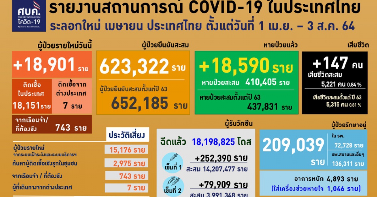 สำนักข่าวอิศรา (www.isranews.org) รายงานว่า เมื่อวันที่ 3 ส.ค.2564 ศูนย์บริหารสถานการณ์โควิด (ศบค.) รายงานสถานการณ์ประจำวัน โดยพบผู้ติดเชื้อรายใหม่ 18,901 ราย ติดเชื้อในประเทศ 18,151 ราย เกิดจากระบบเฝ้าระวังและระบบบริการฯ 15,176 ราย เกิดจากการค้นหาเชิงรุกในชุมชน 2,975 ราย ติดเชื้อภายในเรือนจำ 743 ราย และอีก 7 ราย เดินทางกลับมาจากต่างประเทศ รวมผู้ป่วยสะสม 652,185 ราย หายป่วยเพิ่ม 18,590 ราย อยู่ระหว่างรักษาตัวในโรงพยาบาล 209,039 ราย โดยในจำนวนนี้มีอาการหนัก 4,895 ราย และใส่ท่อช่วยหายใจ 1,046 ราย เสียชีวิตเพิ่ม 147 ราย รวมเสียชีวิตสะสม 5,315 ราย