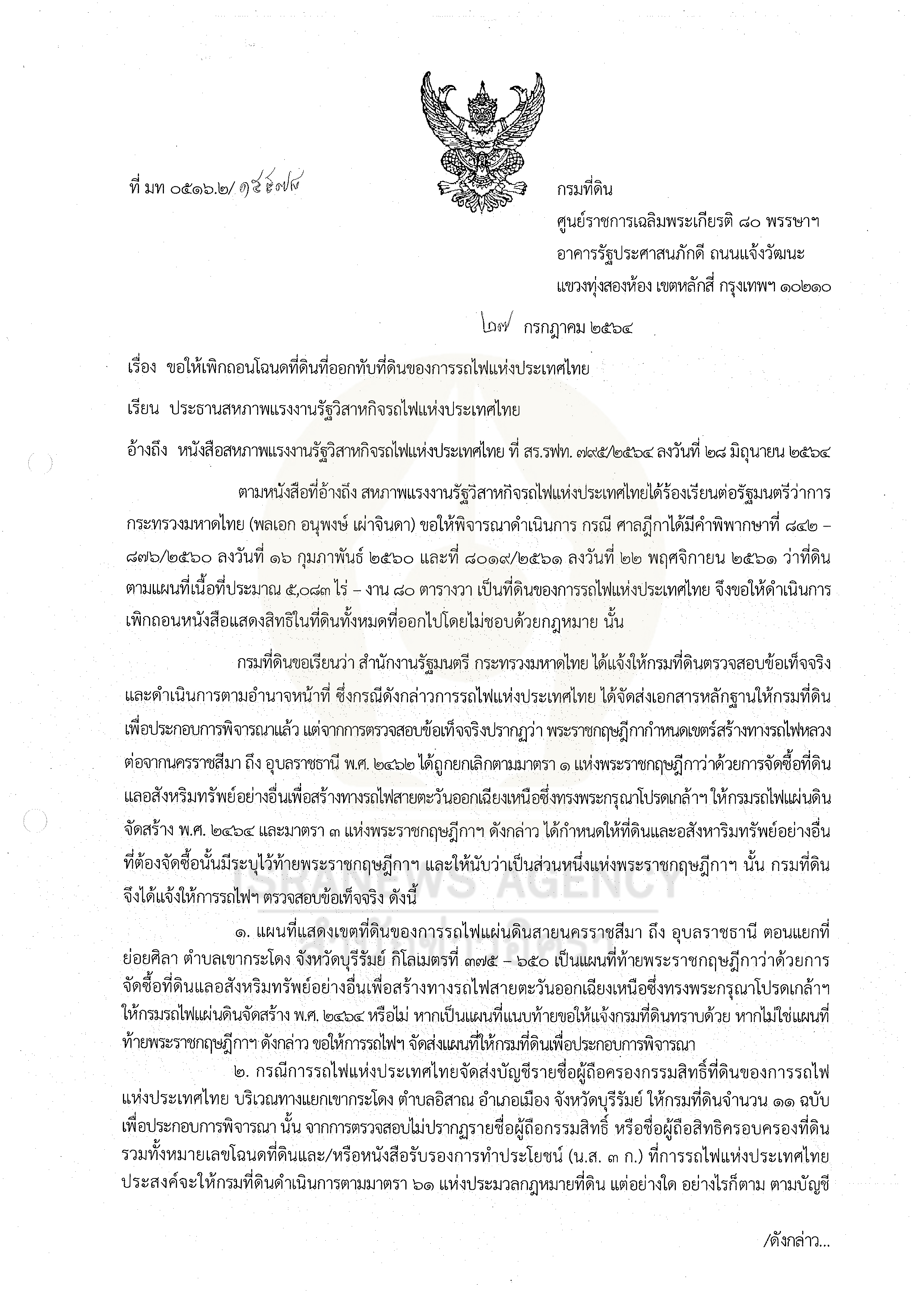 หนังสือดังกล่าวระบุว่า กรมที่ดินขอให้ รฟท.ยืนยันว่า แผนที่แสดงเขตที่ดินของการรถไฟแผ่นดินสายนครราชสีมา ถึง อุบลราชธานี ตอนแยกที่ย่อยศิลา ต.เขากระโดง จ.บุรีรัมย์ กิโลเมตรที่ 375-650 เป็นแผนที่ท้าย พ.ร.ฎ.ว่าด้วยการจัดซื้อที่ดินแลอสังหริมทรัพย์อย่างอื่นเพื่อสร้างทางรถไฟสายตะวันออกเฉียงเหนือซึ่งทรงพระกรุณาโปรดเกล้าฯให้กรมรถไฟเผ่นดินจัดสร้าง พ.ศ.2464 หรือไม่ หากเป็นแผนที่แนบท้ายขอให้แจ้งกรมที่ดินทราบด้วย หากไม่ใช่แผนที่ท้าย พ.ร.ฎ.ฯ ดังกล่าว ขอให้ รฟท.จัดส่งแผนที่ให้กรมที่ดินเพื่อประกอบการพิจารณา