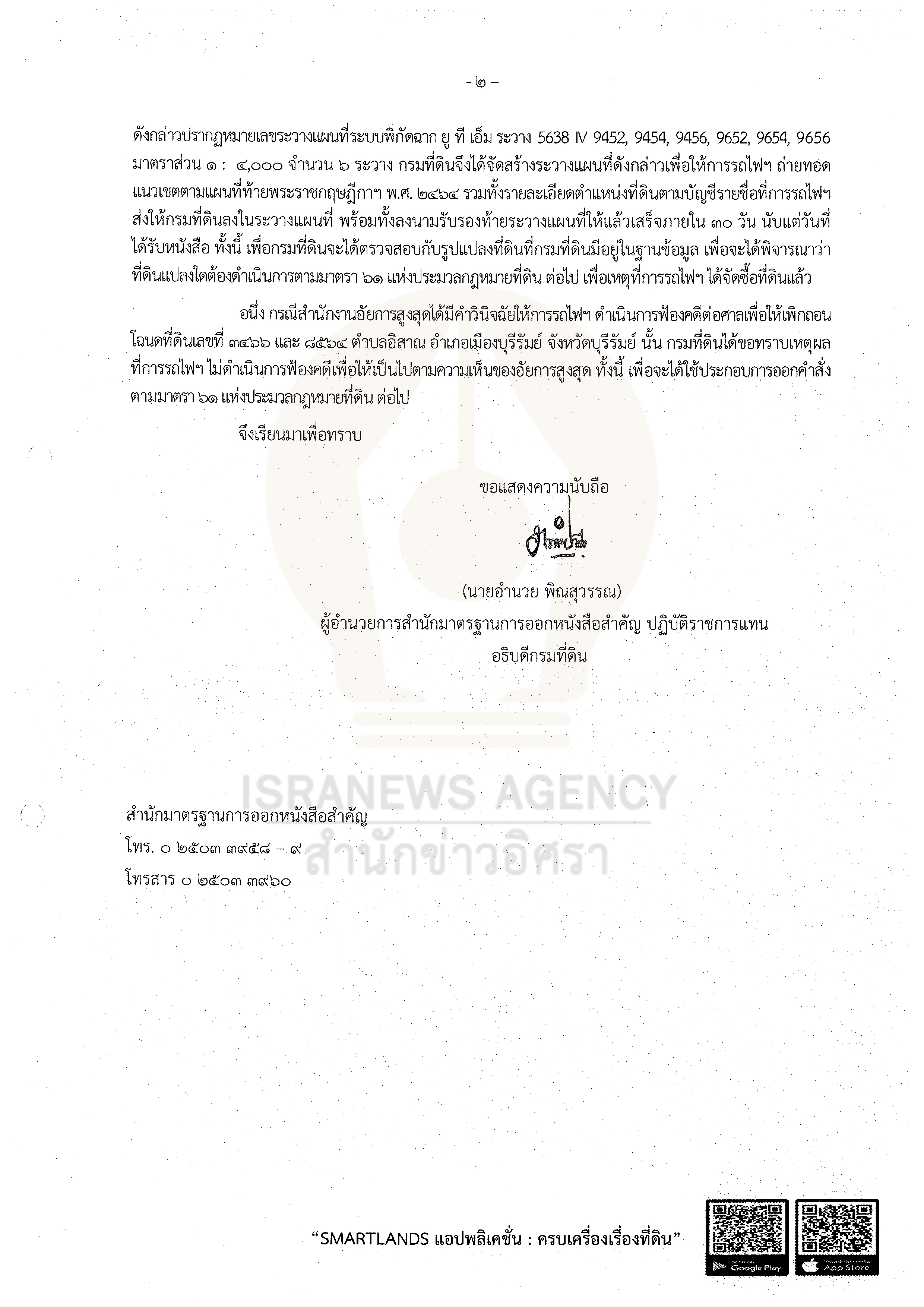 อนึ่ง กรณีสำนักงานอัยการสูงสุดได้มีคำวินิจฉัยให้การรถไฟฯ ดำเนินการฟ้องคดีต่อศาลเพื่อให้เพิกถอนโฉนดที่ดินเลขที่ 3466 และ 8564 ต.อิสาณ อ.เมืองบุรีรัมย์ จ.บุรีรัมย์ นั้น กรมที่ดินได้ขอทราบเหตุผลที่ รฟท. ไม่ดำเนินการฟ้องคดีเพื่อให้เป็นไปตามความเห็นของอัยการสูงสุด ทั้งนี้ เพื่อจะได้ใช้ประกอบการออกคำสั่งตามมาตรา 61 แห่งประมวลกฎหมายที่ดิน ต่อไป