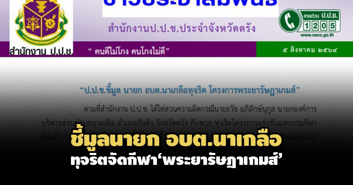 ผู้สื่อข่าวรายงานว่า เมื่อวันที่ 5 ส.ค. 2564 สำนักงานคณะกรรมการป้องกันและปราบปรามการทุจริตแห่งชาติ (ป.ป.ช.) จังหวัดตรัง เผยแพร่เอกสารข่าว (Press Release) ระบุว่า เมื่อวันที่ 20 พ.ค. 2564 ที่ผ่านมา ที่ประชุมคณะกรรมการ ป.ป.ช. มีมติครั้งที่ 72/2564 ชี้มูลความผิด นายธวัช อภิลักษ์นุกูล นายกองค์การบริหารส่วนตำบล (อบต.) นาเกลือ อำเภอกันตัง จังหวัดตรัง กับพวก ทุจริตโครงการแข่งขันมหกรรมกีฬาท้องถิ่นพระยารัษฎาเกมส์ ครั้งที่ 11 วงเงิน 1,800,000 บาท และอนุมัติสั่งจ่ายเช็คไม่เป็นไปตามระเบียบของทางราชการ ดำเนินการจัดซื้อจัดจ้าง อันมีลักษณะเป็นการแบ่งซื้อแบ่งจ้างหลายรายการ เพื่อหลีกเลี่ยงการจัดจ้างโดยวิธีสอบราคา