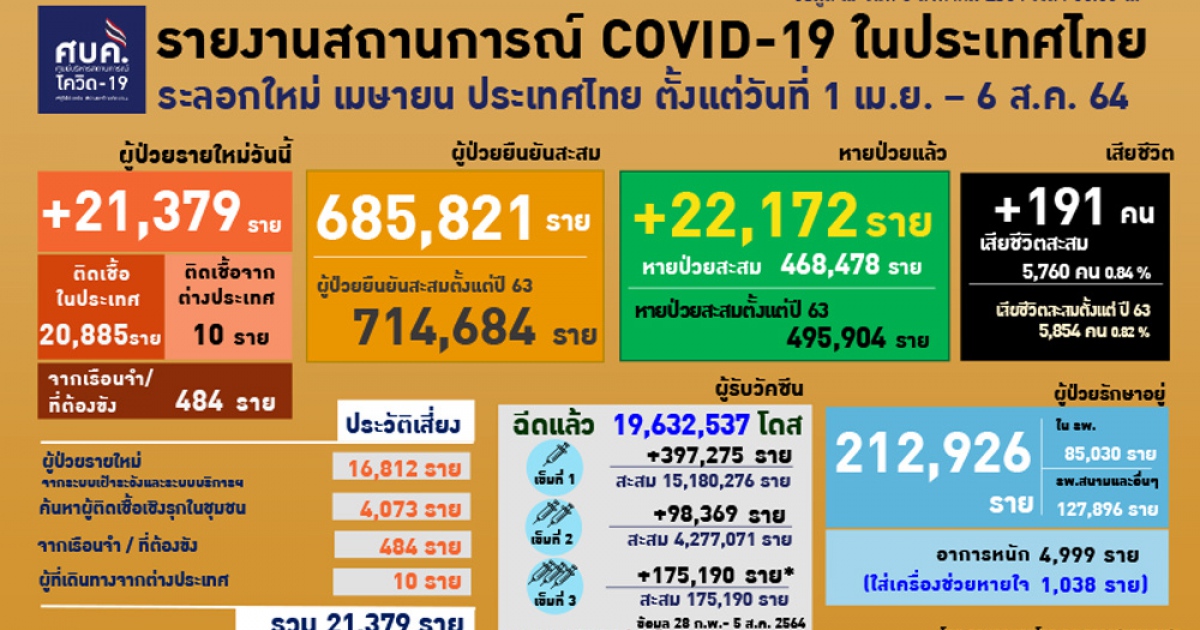 สำนักข่าวอิศรา (www.isranews.org) รายงานว่า เมื่อวันที่ 6 ส.ค.2564 ศูนย์บริหารสถานการณ์โควิด (ศบค.) รายงานสถานการณ์ประจำวัน โดยพบผู้ติดเชื้อรายใหม่ 21,379 ราย ติดเชื้อในประเทศ 20,885 ราย เกิดจากระบบเฝ้าระวังและระบบบริการฯ 16,812 ราย เกิดจากการค้นหาเชิงรุกในชุมชน 4,073 ราย ติดเชื้อภายในเรือนจำ 484 ราย และอีก 10 ราย เดินทางกลับมาจากต่างประเทศ รวมผู้ป่วยสะสม 714,684 ราย หายป่วยเพิ่ม 22,172 ราย อยู่ระหว่างรักษาตัวในโรงพยาบาล 212,926 ราย โดยในจำนวนนี้มีอาการหนัก 4,999 ราย และใส่ท่อช่วยหายใจ 1,038 ราย เสียชีวิตเพิ่ม 191 ราย รวมเสียชีวิตสะสม 5,854 ราย