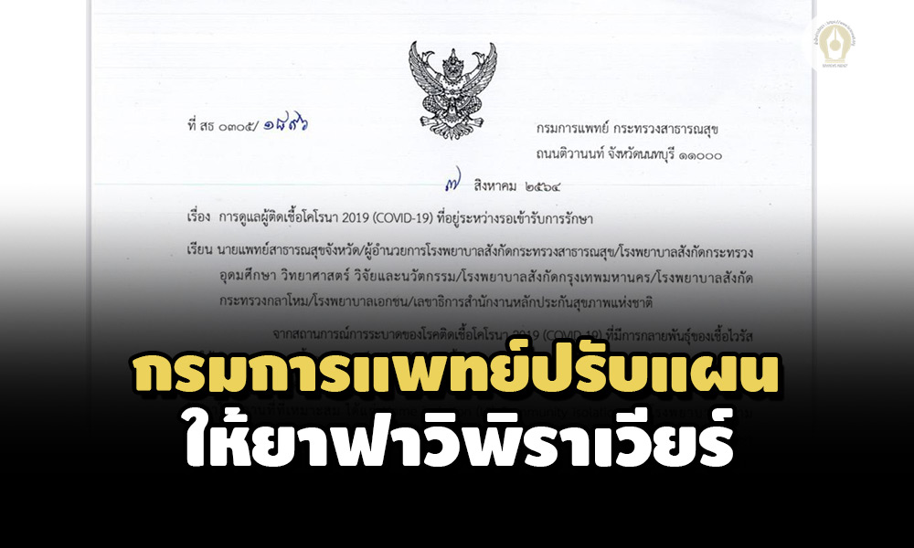 กรมการแพทย์ปรับแผนให้ยาฟาวิพิราเวียร์ แนะจ่ายยาผู้ป่วยโควิดทุกรายทันที เพื่อให้การรักษาเกิดประโยชน์สูงสุดต่อผู้ติดเชื้อ