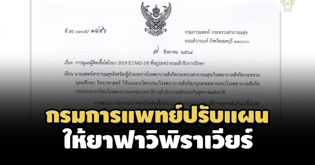 กรมการแพทย์ ขอแจ้งให้ทราบว่าผู้ติดเชื้อเข้าข่าย (Propable case) และผู้ติดเชื้อยืนยัน (Confirmed case) ที่อยู่ระหว่างรอเข้ารับการรักษาควรได้รับยาฟาวิพิราเวียร์ทันที ตามแนวทางดังกล่าว เพื่อให้การรักษาเกิดประโยชน์สูงสุดต่อผู้ติด ทั้งนี้ สถานะการรอเข้ารับการรักษาของผู้ติดเชื้อไม่ควรเป็นอุปสรรคต่อการเข้าถึงยาฟาวิพิราเวียร์