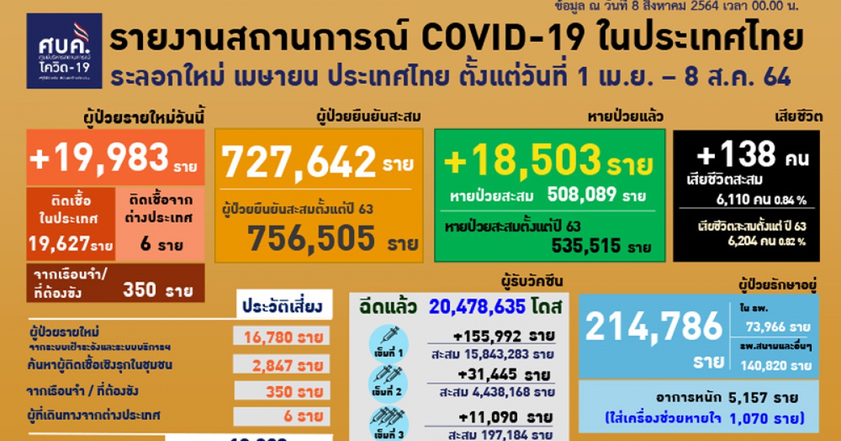 สำนักข่าวอิศรา (www.isranews.org) ผู้สื่อข่าวรายงานว่า เมื่อวันที่ 7 ส.ค.2564 ศูนย์บริหารสถานการณ์โควิด (ศบค.) รายงานสถานการณ์ประจำวัน ว่า พบผู้ติดเชื้อรายใหม่ 19,983 ราย ติดเชื้อในประเทศ 19,627 ราย เกิดจากระบบเฝ้าระวังและระบบบริการฯ 16,780 ราย เกิดจากการค้นหาเชิงรุกในชุมชน 2,847 ราย ติดเชื้อภายในเรือนจำ 350 ราย และอีก 6 ราย เดินทางกลับมาจากต่างประเทศ รวมผู้ป่วยสะสม 756,505 ราย หายป่วยเพิ่ม 18,503 ราย อยู่ระหว่างรักษาตัวในโรงพยาบาล 214,786 ราย โดยในจำนวนนี้มีอาการหนัก 5,157 ราย และใส่ท่อช่วยหายใจ 1,070 ราย เสียชีวิตเพิ่ม 138 ราย รวมเสียชีวิตสะสม 6,204 ราย