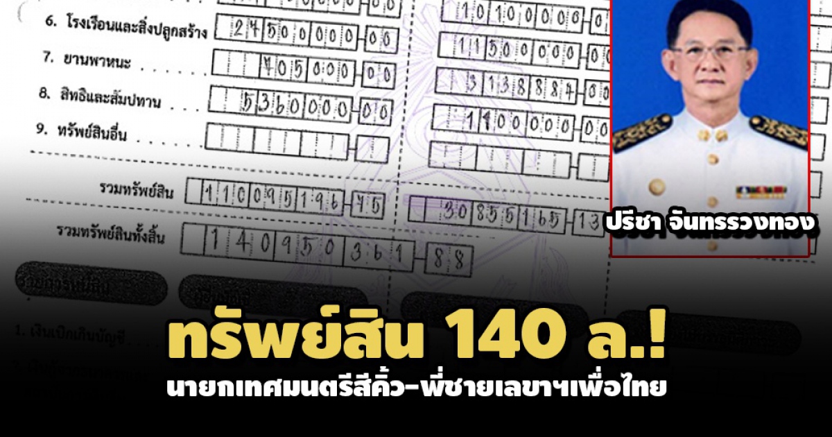 รวมทั้งคู่มีทรัพย์สินทั้งสิ้น 140,950,361 บาท มีหนี้สินทั้งสิ้น 5,183,679 บาท