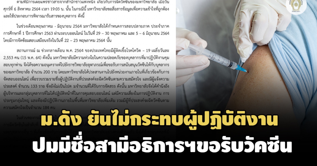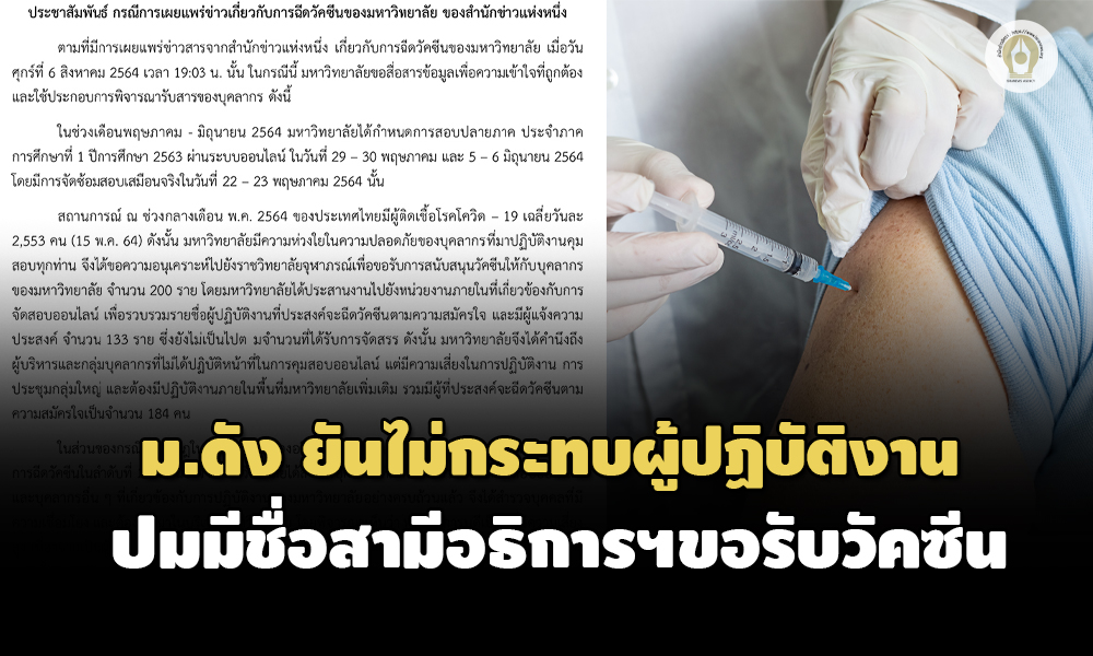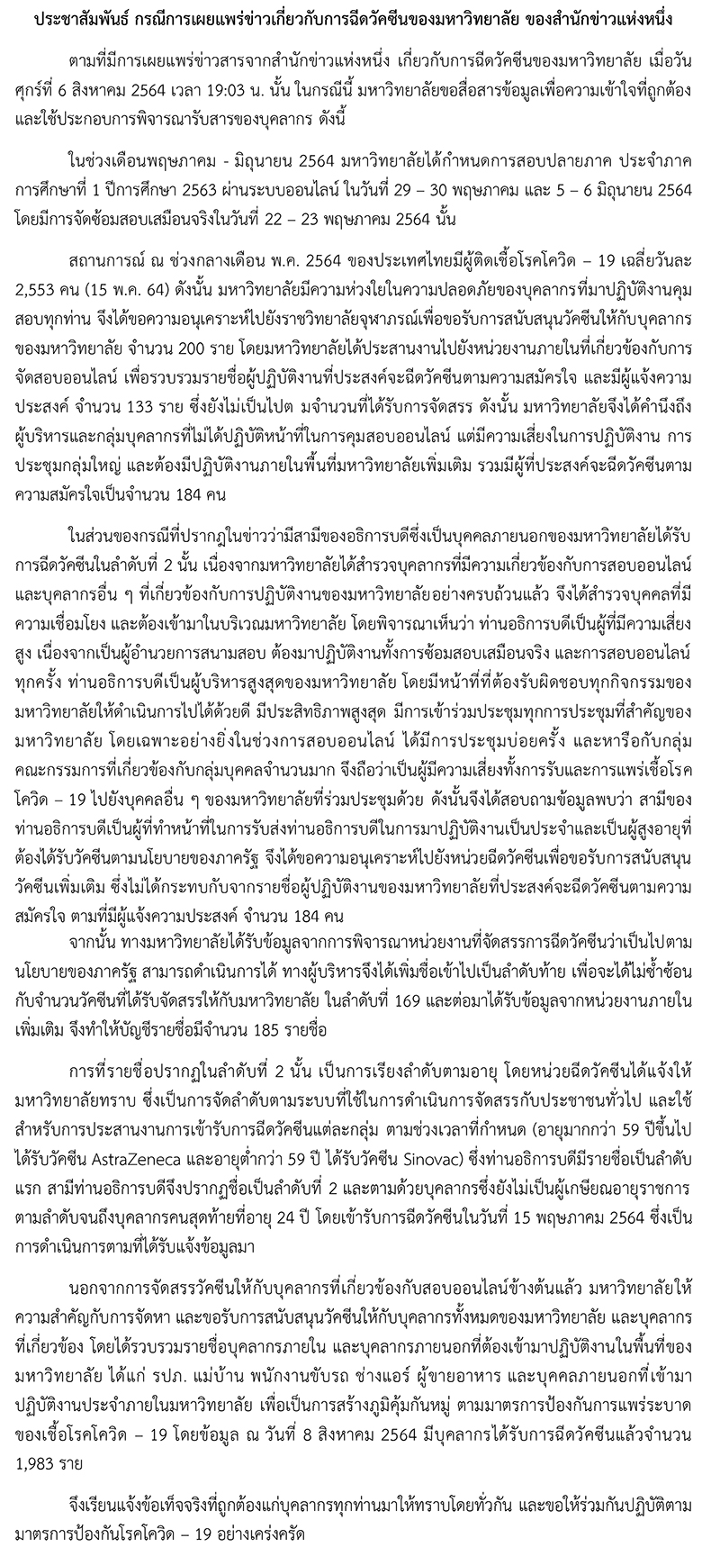ตามที่มีการเผยแพร่ข่าวสารจากสำนักข่าวแห่งหนึ่ง เกี่ยวกับการฉีดวัคซีนของมหาวิทยาลัย เมื่อวันศุกร์ที่ 6 สิงหาคม 2564 เวลา 19:03 น. นั้น ในกรณีนี้ มหาวิทยาลัยขอสื่อสารข้อมูลเพื่อความเข้าใจที่ถูกต้อง และใช้ประกอบการพิจารณารับสารของบุคลากร ดังนี้
