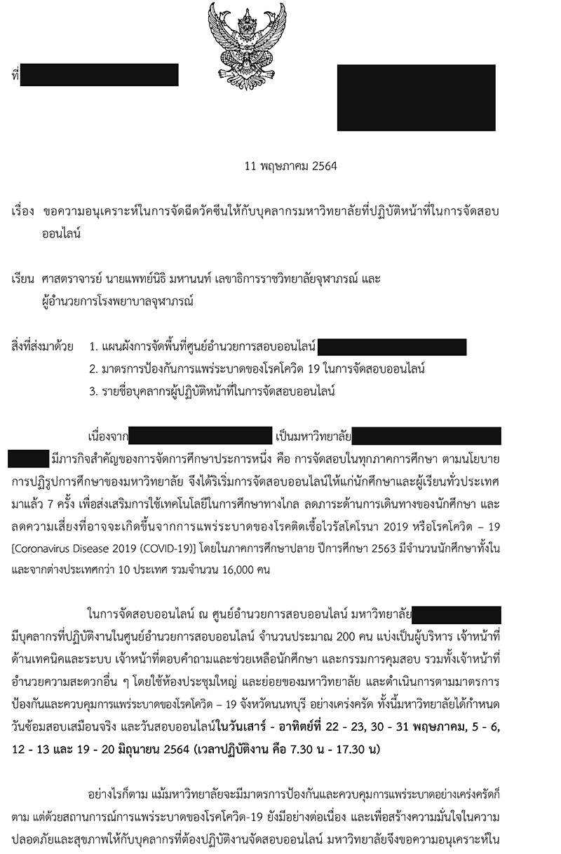 สถานการณ์ ณ ช่วงกลางเดือน พ.ค. 2564 ของประเทศไทยมีผู้ติดเชื้อโรคโควิด – 19 เฉลี่ยวันละ 2,553 คน (15 พ.ค. 64) ดังนั้น มหาวิทยาลัยมีความห่วงใยในความปลอดภัยของบุคลากรที่มาปฏิบัติงานคุมสอบทุกท่าน จึงได้ขอความอนุเคราะห์ไปยังราชวิทยาลัยจุฬาภรณ์เพื่อขอรับการสนับสนุนวัคซีนให้กับบุคลากรของมหาวิทยาลัย จำนวน 200 ราย โดยมหาวิทยาลัยได้ประสานงานไปยังหน่วยงานภายในที่เกี่ยวข้องกับการจัดสอบออนไลน์ เพื่อรวบรวมรายชื่อผู้ปฏิบัติงานที่ประสงค์จะฉีดวัคซีนตามความสมัครใจ และมีผู้แจ้งความประสงค์ จำนวน 133 ราย ซึ่งยังไม่เป็นไปตามจำนวนที่ได้รับการจัดสรร ดังนั้นมหาวิทยาลัยจึงได้คำนึงถึงผู้บริหารและกลุ่มบุคลากรที่ไม่ได้ปฏิบัติหน้าที่ในการคุมสอบออนไลน์ แต่มีความเสี่ยงในการปฏิบัติงาน การประชุมกลุ่มใหญ่ และต้องมีปฏิบัติงานภายในพื้นที่มหาวิทยาลัยเพิ่มเติม รวมมีผู้ที่ประสงค์จะฉีดวัคซีนตามความสมัครใจเป็นจำนวน 184 คน