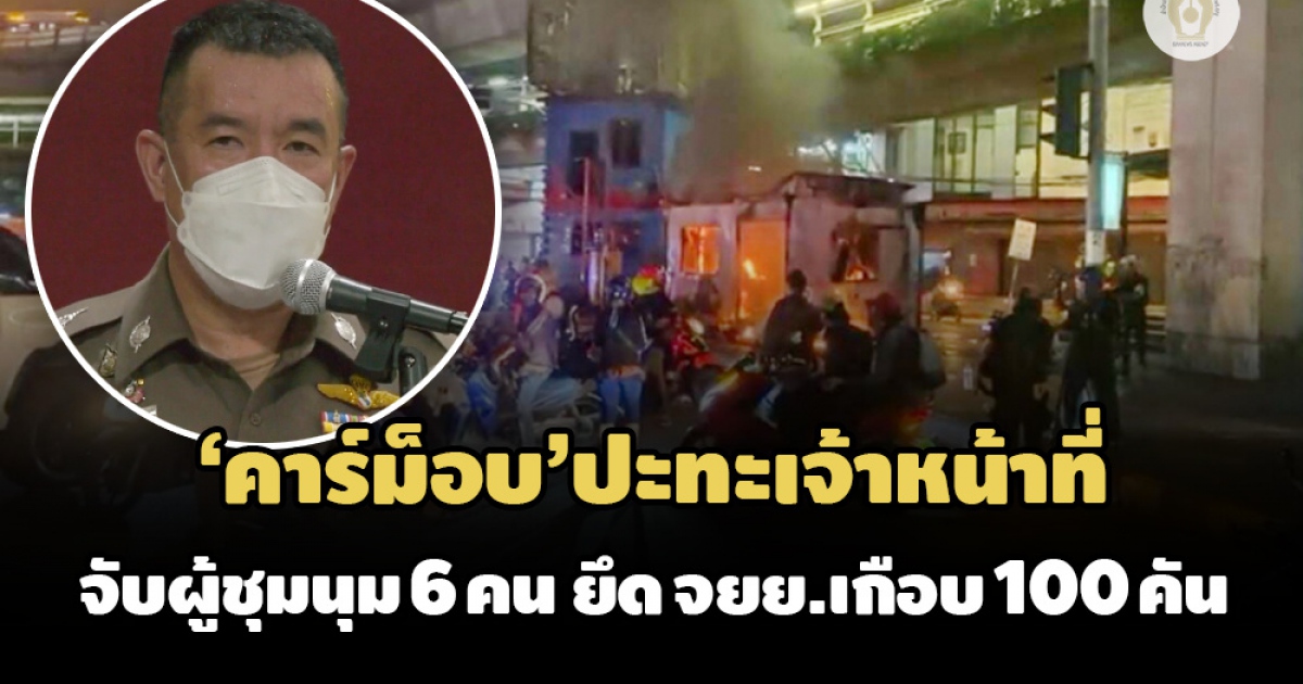 บช.น.สรุปสถานการณ์ชุมนุม ‘คาร์ม็อบ 10 สิงหา’ พบการปะทะเจ้าหน้าที่หลายจุด ตำรวจบาดเจ็บ 6 นาย - เผาทำลายป้อมจราจร 2 ป้อม ส่วนผู้ชุมนุมถูกจับ 6 ราย พร้อมยึดรถจักรยานยนต์เกือบ 100 คัน