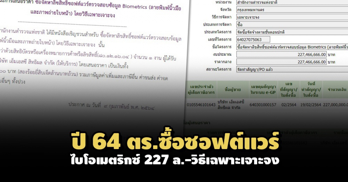 ตร.จัดซื้อซอฟต์แวร์ ‘ไบโอเมตริกซ์’ ก.พ. 64 วงเงิน 227 ล. บ.เอ็มเอสซี สิทธิผลฯ คว้างานอีก ก่อน ป.ป.ช.ตั้งองค์คณะใหญ่ไต่สวน ‘พล.ต.อ.จักรทิพย์-บิ๊ก ตร.’ ปมจัดซื้อเครื่องตรวจสอบอัตลักษณ์บุคคลฯ 2.1 พันล. ปี 62