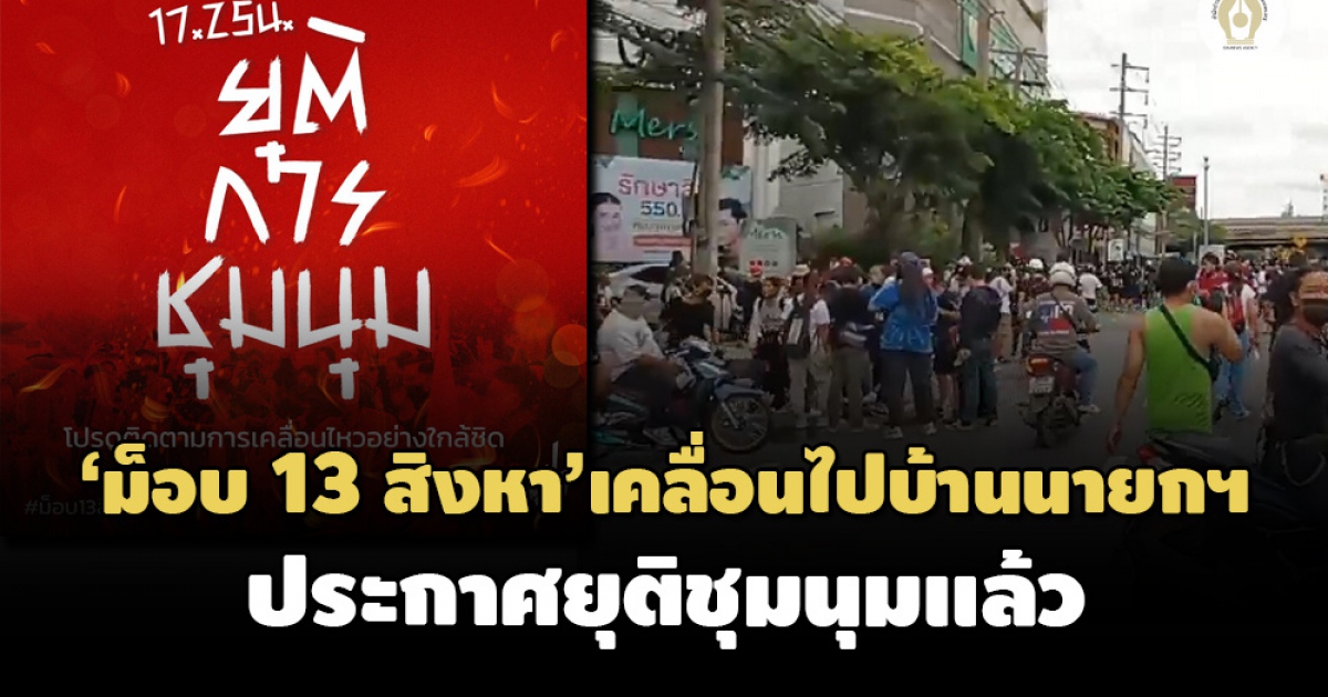 กลุ่มทะลุฟ้า ประกาศยุติการชุมนุม 'ม็อบ 13 สิงหา' หลังเคลื่อนขบวนจากอนุสาวรีย์ชัยสมรภูมิ ไปบ้านนายกฯ แต่ติดตู้คอนเทนเนอร์ - แนวตำรวจบริเวณถนนวิภาวดีฯ ขณะที่เจ้าหน้าที่ใช้กระสุนยาง - แก๊สน้ำตายิงสกัด มีรายงานว่า 'ไฮโซลูกนัท' แกนนำถูกยิงได้รับบาดเจ็บถูกนำตัวส่ง รพ.แล้ว