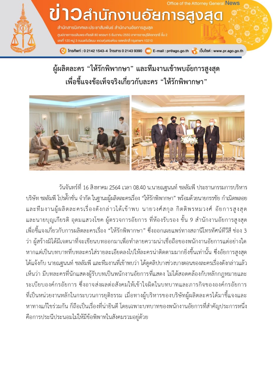 ต่อมา เมื่อเวลาประมาณ 12.30 น. สำนักงาน อสส. เผยแพร่เอกสารข่าว (Press Release) กรณีดังกล่าว ระบุว่า เมื่อวันที่ 16 ส.ค. 2564 นายณฐนนท์ ชลลัมพี ประธานกรรมการบริหารบริษัท ชลลัมพี โปรดั๊กชั่น จำกัด ในฐานะผู้ผลิตละครเรื่อง ‘ให้รักพิพากษา’ พร้อมด้วยนายกรรชัย กำเนิดพลอย และทีมงานผู้ผลิตละครดังกล่าว เข้าพบนายวงศ์สกุล กิตติพรหมวงศ์ อสส. และนายบุญเกียรติ อุดมแสวงโชค ผู้ตรวจการอัยการ ที่ห้องรับรองชั้น 9 สำนักงาน อสส. เพื่อชี้แจงเกี่ยวกับการผลิตละครดังกล่าว ที่เผยแพร่ทางสถานีโทรทัศน์ช่อง 3