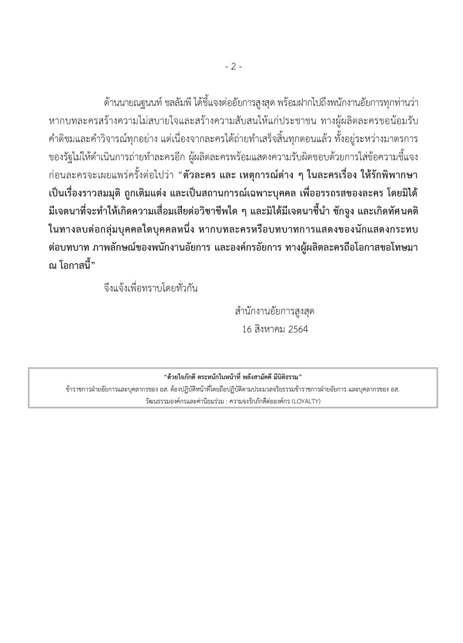 โดยคณะผู้จัดละคร ระบุว่า ผู้สร้างมิได้มีเจตนาจะเขียนบทออกมาเพื่อทำลายความน่าเชื่อถือของพนักงานอัยการแต่อย่างใด หากแต่เป็นบทบาทที่บทละครใส่รายละเอียดลงไปให้ละครน่าติดตามมากยิ่งขึ้นเท่านั้น โดย อสส. ได้แจ้งกับนายณฐนนท์ และทีมงานที่เข้าพบว่า ได้ดูคลิปบางช่วงบางตอนของละครเรื่องดังกล่าวแล้วเห็นว่า มีบทละครที่นักแสดงผู้รับบทเป็นพนักงานอัยการที่แสดง ไม่ได้สอดคล้องกับหลักกฎหมายและระเบียบองค์กรอัยการ อาจตส่งผลต่อสังคมให้เข้าใจผิดในบทบาทและภารกิจขององค์กรอัยการ ที่เป็นหน่วยงานหลักในกระบวนการยุติธรรม เมื่อผู้บริหารของบริษัทผู้ผลิตละครมาชี้แจงและหาแนวทางแก้ไขร่วมกันได้ ถือเป็นเรื่องน่ายินดี โดยเฉพาะบทบาทของพนักงานอัยการที่สำคัญประการหนึ่งคือ การประนีประนอมไม่ให้มีข้อพิพาทในสังคมรวมอยู่ด้วย