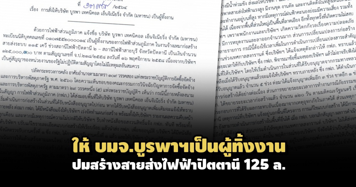 รายละเอียดในหนังสือดังกล่าว ระบุว่า เนื่องจาก กฟภ. แจ้งชื่อ บมจ.บูรพาฯ เป็นผู้ทิ้งงานโครงการก่อสร้างสายส่งระบบ 115 เควีฯ ดังกล่าว เป็นเงินจำนวน 125 ล้านบาท ตามสัญญาเลขที่ จ.ป.218/2558 ลงวันที่ 16 พ.ย. 2558 เนื่องจาก บมจ.บูรพาฯ เป็นคู่สัญญาของหน่วยงานของรัฐไม่ปฏิบัติตามสัญญาโดยไม่มีเหตุผลอันสมควร ปลัดกระทรวงการคลัง อาศัยอำนาจตามมาตรา 109 วรรคสอง แห่ง พ.ร.บ.การจัดซื้อจัดจ้างและการบริหารพัสดุภาครัฐ พ.ศ. 2560 โดยความเห็นชอบของคณะกรรมการวินิจฉัยปัญหาการจัดซื้อจัดจ้างและการบริหารพัสดุภาครัฐ ตามมาตรา 29 วรรคหนึ่ง (5) แห่ง พ.ร.บ.ดังกล่าว เห็นว่า กรณีนี้ภายหลังลงนามในสัญญา กฟภ. ส่งมอบพื้นที่ให้ บมจ.บูรพาฯ เริ่มดำเนินการก่อสร้างในส่วนที่ได้รับหนังสืออนุญาตไปก่อน หากได้รับหนังสืออนุญาตเพิ่มเติมจะแจ้งให้ทราบภายหลัง ต่อมา กฟภ. มีหนังสือแจ้งให้ บมจ.บูรพาฯ เร่งจัดทำแผนก่อสร้าง พร้อมให้รายงานผลความคืบหน้าทุกเดือน และหากมีเหตุการณ์ความไม่ปกติให้ บมจ.บูรพาฯ รีบทำหนังสือขอสงวนสิทธิ์แจ้ง กฟภ. ทันที พร้อมทั้งให้ปรับแก้ไขรายละเอียดแบบก่อสร้างให้เรียบร้อย แล้วนำส่ง กฟภ.เพื่อขออนุมัติ
