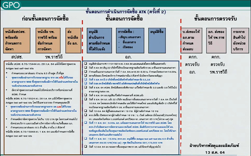 ด้าน นางศิรินุช ชีวันพิศาลนุกูล รองผู้อำนวยการองค์การเภสัชกรรม (อภ.) กล่าวว่า อภ.ได้รับมอบหมายให้เป็นผู้จัดหายาและเวชภัณฑ์สำหรับ สปสช. โดยขั้นตอนการจัดซื้อจัดหา ATK จะมี 3 กระบวนการ คือ 1) ก่อนจัดซื้อ 2) จัดซื้อ และ 3) ตรวจรับและส่งมอบ ทั้งนี้ สำหรับขั้นตอนก่อนการจัดซื้อจะต้องมีข้อกำหนด และแผนความต้องการจาก สปสช. โดยเสนอผ่าน รพ.ราชวิถี แล้วส่งต่อมาที่ อภ.อีกครั้งหนึ่ง โดยแนบข้อกำหนด (TOR) จาก สปสช. หรือข้อกำหนดที่ดำเนินการร่วมกัน โดย TOR ที่รับเบื้องต้นจากผู้ใช้งานมานั้น อภ.จะนำมาปรับเป็นข้อกำหนดในการสั่งซื้อตามมาตรฐานของ อภ.อีกครั้ง