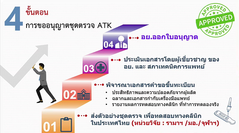 นพ.ไพศาล กล่าวถึงส่วนขั้นตอนการขออนุญาต ว่า การขออนุญาตชุดตรวจ ATK มี 4 ขั้นตอน ได้แก่ ขั้นตอนที่่ 1 ผู้ผลิตหรือผู้นำเข้าต้องส่งตัวอย่างชุดตรวจเพื่อนำไปทดสอบทางคลินิกในประเทศไทย โดยหน่วยวิจัยของ คณะแพทย์ศาสตร์ รพ.รามาธิบดี มหาวิทยาลัยมหิดล คณะแพทย์ศาสตร์ จุฬาลงกรณ์มหาวิทยาลัย, คณะแพทย์ศาสตร์ และคณะเทคนิคการแพทย์ มหาวิทยาลัยสงขลานครินทร์ ต่อมาขั้นตอนที่ 2 พิจารณาเอกสารคำขอขึ้นทะเบียน เช่น ประสิทธิภาพ และความปลอดภัยจากผู้ผลิต ฉลากและเอกสารกำกับเครื่องมือแพทย์ รายงานผลการทดสอบทางคลินิกที่ทำการทดลองจริง ขั้นตอนที่ 3 ประเมินเอกสารโดยผู้เชี่ยวชาญของอยและสภาเทคนิคการแพทย์ และขั้นตอน 4 อย. ออกใบอนุญาต