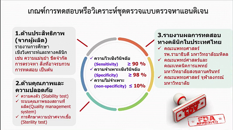 สำหรับเกณฑ์การทดสอบหรือวิเคราะห์ชุดตรวจ ประกอบด้วย 1) ด้านประสิทธิภาพ เช่น ความแม่นยำ 2) ด้านคุณภาพและความปลอดภัย เช่น ความคงตัว และ 3) รายงานผลการทดสอบทางคลินิกในประเทศไทยว่า มีความไวเชิงวินิจฉัยตั้งแต่ 90% ขึ้นไป มีความจำเพาะเชิงวินิจฉัยตั้งแต่ 98% ขึ้นไป และมีความไม่จำเพาะไม่เกิน 10%