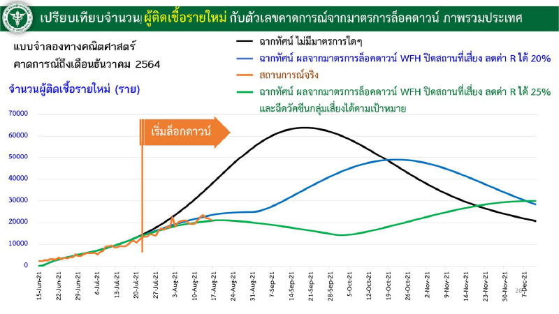 ผู้สื่อข่าวรายงานว่า เมื่อวันที่ 16 ส.ค.2564 นพ.ทวีศิลป์ วิษณุโยธิน โฆษกศูนย์บริหารสถานการณ์โควิด (ศบค.) แถลงผลการประชุม ศบค.ครั้งที่ 12/2564 ว่า นพ.เกียรติภูมิ วงศ์รจิต ปลัดกระทรวงสาธารณสุข รายงานผลการประเมินผลมาตรการป้องกันโควิดในช่วงที่ผ่านมา ผ่านแบบจำลองทางคณิตศาสตร์เพื่อคาดการณ์สถานการณ์จนถึงเดือน ธ.ค.2564 พบว่า หากไม่มีการล็อกดาวน์ เราอาจพบผู้ป่วยสูงขึ้นถึง 6-7 หมื่นรายในช่วงเดือนหน้า แต่หากมีการใช้ล็อกดาวน์ ทำงานอยู่บ้าน ปิดสถานที่เสี่ยง จะลดได้ประมาณ 20% หากเพิ่มมาตรการเข้มขึ้น 25% จะสามารถทำให้สถานการณ์ผู้ป่วยลดลงจนถึง ต.ค.2564 ส่วนจำนวนผู้เสียชีวิต จะพบว่าสถานการณณ์ใกล้เคียงกับฉากทัศน์ที่มีผลมาจากการเพิ่มมมาตรการล็อกดาวน์ ทำงานอยู่บ้าน ปิดสถานที่เสี่ยง ที่มีประสิทธิภาพ 25% ที่ประชุมยังได้รับทราบผลของมาตรการจำกัดการเดินทางของ กทม. และ ชลบุรี พบว่าเมื่อเปรียบเทียบปัจจุบันกับการบังคับใช้มาตรการก่อนหน้านี้ช่วง เม.ย.2564 จะพบว่า ประชาชนให้ความร่วมมือในการทำตามมาตรการ จนทำให้สถานการณ์ดีขึ้น