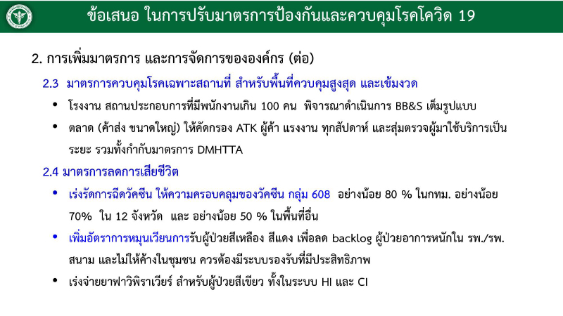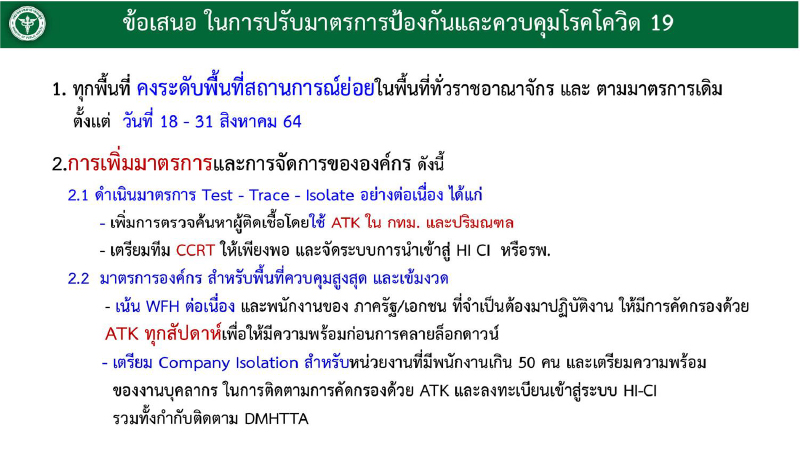 2.มาตรการองค์กร สำหรับพื้นที่ควบคุมสูงสุดและเข้มงวด เน้นทำงานที่บ้าน พนักงานของภาครัฐและเอกชน ที่จำเป็นต้องมาปฏิบัติงาน ให้มีการคัดกรองด้วย ATK ทุกสัปดาห์ รวมถึงเตรียม Company Isolation หรือสถานที่กักตัวสำหรับหน่วยงานที่มีพนักงานเกิน 50 คน และเตรียมความพร้อมของบุคลากรในการติดตามการคัดกรอง และลงทะเบียนเข้าสู่ระบบ Hi หรือ Ci ต่อไป
