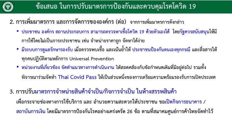 5.สำหรับประชาชน องค์กร สถานประกอบการ ควรตรวจหาเชื้อโควิดด้วยตัวเองได้ รัฐควรสนับสนุนให้มีการใช้โดยไม่เป็นภาระของประชาชน เช่น จำหน่ายราคาถูก หรือ จัดหาได้ง่าย มีระบบการดูแลรักษารองรับ เมื่อตรวจพบเชื้อ และเน้นย้ำให้ประชาชนป้องกันตนเองทุกกรณี และสื่อสารให้ทุกคนปฏิบัติตามหลักการ การป้องกันตนเองของประชาชนในทุกกรณี (Universal Prevention) หน่วยงานที่เกี่ยวข้องต้องจัดทำแนวทางดำเนินการ ร่วมกันจัดทำ Thai Covid Pass ยืนยันการฉีดวัคซีนครบโดส เพื่อให้เป็นส่วนหนึ่งการเตรียมความพร้อมรองรับการเปิดประเทศ