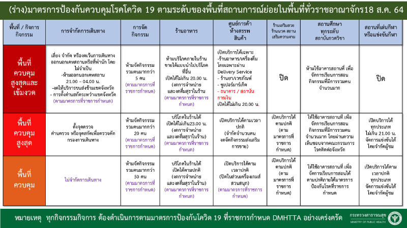 นพ.ทวีศิลป์ กล่าวว่า ที่ประชุมรับทราบข้อเสนอจากกระทรวงสาธารณสุข ว่า ให้คงระดับพื้นที่สถานการณ์ตามเดิม โดยให้ขยายเวลาการบังคับใช้ต่อเนื่องจาก 18 - 31 ส.ค.2564 โดยให้เพิ่มมาตรการและจัดการองค์กร ดังนี้