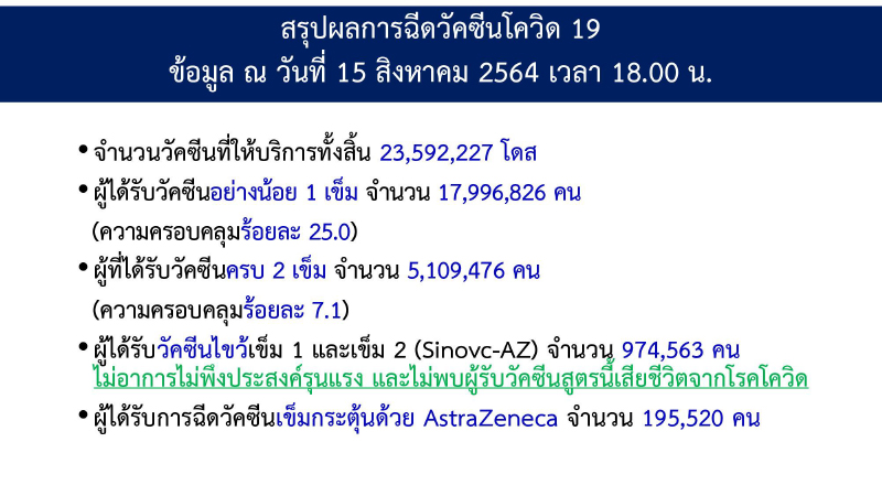 นพ.ทวีศิลป์ กล่าวด้วยว่า สำหรับแผนการให้บริการวัคซีนโควิด จนถึงวันที่ 15 ส.ค.2564 เวลา 18.00 น.มีการฉีดวัคซีนแล้ว 23,592,227 โดส แบ่งเป็น ผู้ได้รับวัคซีน 1 เข็ม จำนวน 17,996,826 คน คิดเป็น 25% ผู้ได้รับวัคซีน 2 เข็ม จำนวน 5,109,476 คน คิดเป็น 7.1%