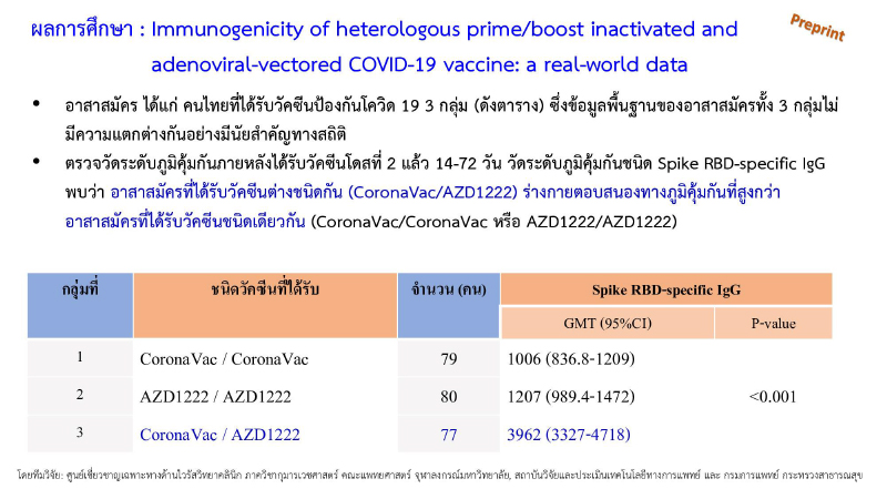 นพ.ทวีศิลป์ กล่าวอีกว่า จากการศึกษาพบว่า ผู้ที่ฉีดวัคซีนไขว้ 2 ยี่ห้อ จำนวน 77 คน กระตุ้นภูมิได้ถึง 3,962 ซึ่งมากกว่ากลุ่มที่ฉีดซิโนแวค 2 เข็ม จำนวน 79 คน กระตุ้นภูมิได้ 1,006 และกลุ่มที่ฉีดแอสตร้าเซนเนก้า 2 เข็ม จำนวน 80 คน กระตุ้นภูมิได้ 1,207 เรียกได้ว่า การฉีดไขว้ 2 ยี่ห้อกระตุ้นภูมิได้มากกว่าแนวทางอื่นเกือบ 4 เท่า