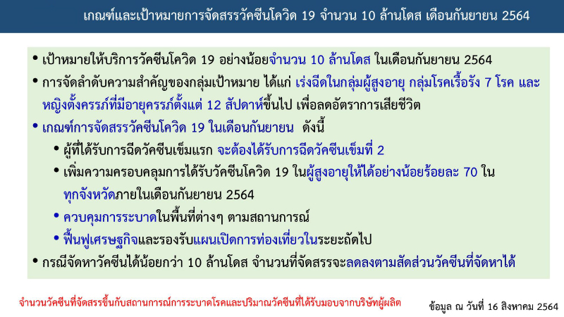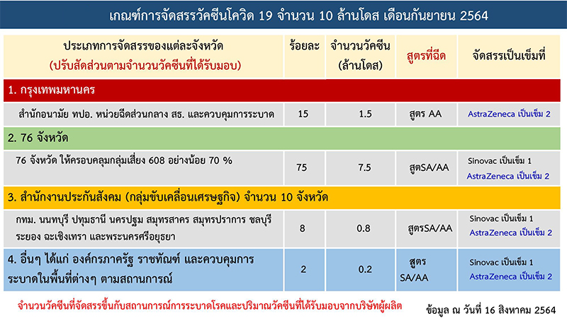 นพ.ทวีศิลป์ กล่าวต่อด้วยว่า ที่ประชุมได้รับทราบเป้าหมายจะต้องหาวัคซีนให้ได้อย่างน้อย 10 ล้านโดสในเดือน ก.ย.2564 พร้อมเร่งฉีดให้กลุ่ม 608 เพื่อลดอัตราการเสียชีวิต โดยเกณฑ์การจัดสรรวัคซีนเดือน ก.ย.2564 จะปูพรมฉีดเข้ม 2 และเพิ่มความครอบคลุมกลุ่มเป้าหมายผู้สูงอายุให้ได้ 70% ในทุกจังหวัด ส่วนกรณีจัดหาวัคซีนได้น้อยกว่า 10 ล้านโดส ให้ลดลงตามสัดส่วนวัคซีนที่จัดหาได้