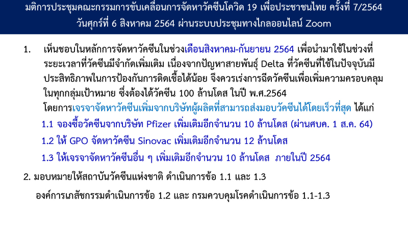 ที่ประชุมเห็นชอบการจัดหาวัคซีนช่วง ส.ค.-ก.ย.2564 โดยให้สั่งจองไฟเซอร์เพิ่ม 10 ล้านโดสที่ผ่านที่ประชุมไปแล้วตั้งแต่ 1 ส.ค.2564 และให้องค์การเภสัชกรรม จัดหาวัคซีนซิโนแวคเพิ่ม 12 ล้านโดส และเจรจาจัดหาวัคซีนอื่นๆ เพิ่มเติมจำนวน 10 ล้านโดสภายในปี 2564