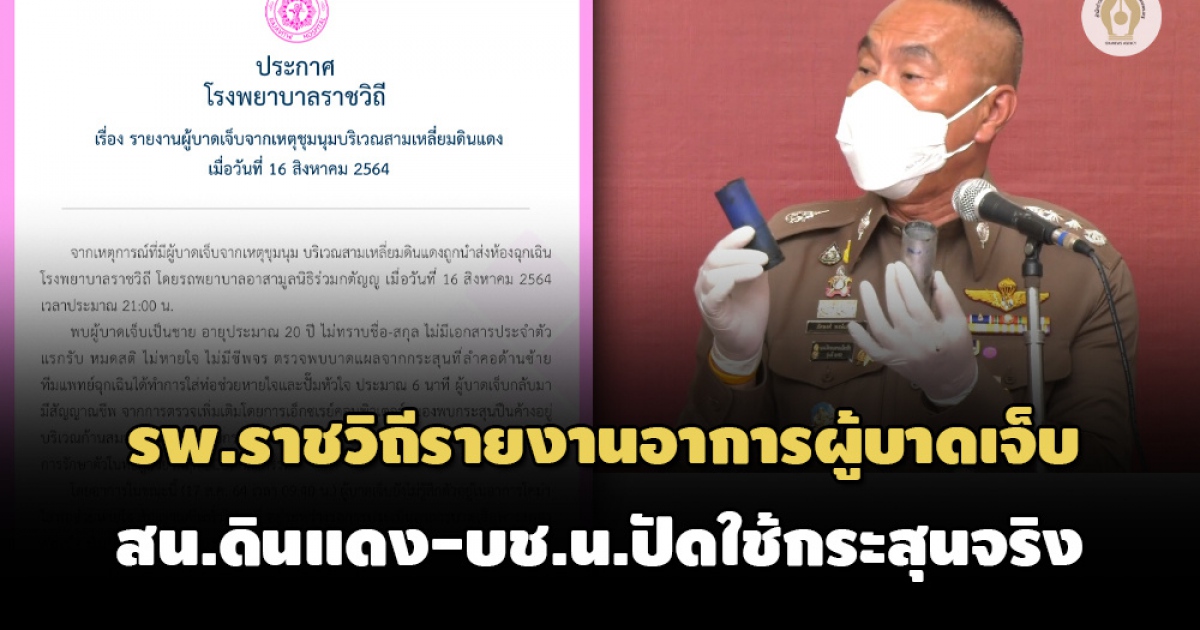 ผู้สื่อข่าวรายงานว่า เมื่อวันที่ 17 ส.ค.2564 โรงพยาบาลราชวิถี ออกประกาศเรื่อง รายงานผู้บาดเจ็บจากเหตุชุมนุมบริเวณสามเหลี่ยมดินแดง เมื่อวันที่ 16 ส.ค.2564 ระบุว่า จากเหตุการณ์ที่มีผู้บาดเจ็บจากเหตุชุมนุม บริเวณสามเหลี่ยมดินแดงถูกนำส่งห้องฉุกเฉิน โรงพยาบาลราชวิถี โดยรถพยาบาลอาสามูลนิธิร่วมกตัญญู เมื่อเวลา 21.00 น.
