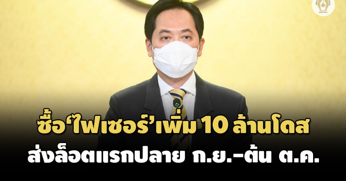ครม.อนุมัติเงิน 9,372 ล้านบาทเศษ จ่ายเงินค่าไฟเซอร์ 20 ล้านโดสที่ไทยลงสัญญาไปก่อนหน้านี้ พร้อมรับทราบแผนการจัดซื้อเพิ่มอีก 10 ล้านโดส คาดส่งมอบล็อกตแรก ปลาย ก.ย. - ต้น ต.ค.2564